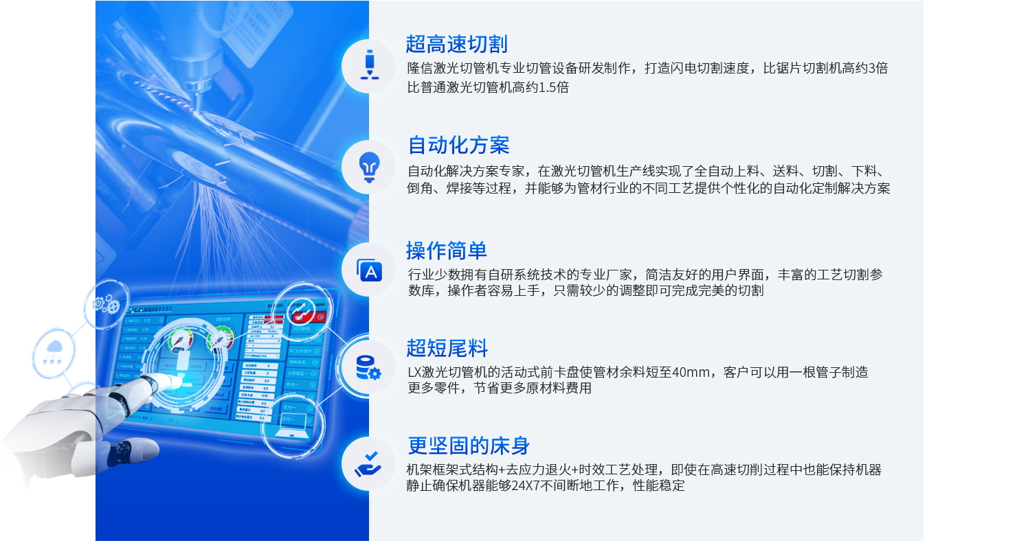 管材加工智能生產(chǎn)線,高度靈活的模塊化設計,多環(huán)節(jié)集成一體,實現(xiàn)自動化生產(chǎn),減少人力成本,提高效率。可根據(jù)行業(yè)需求定制,多種智能加工模式助力企業(yè)快速投產(chǎn)。